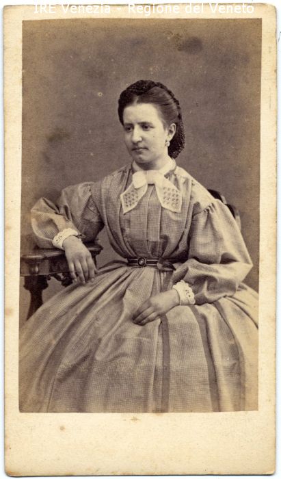 Ritratto: in studio, mezza figura, in semi profilo - Donna: seduta, con il gomito destro appoggiato ad un tavolino - Acconciatura: capelli raccolti, retina - Vestiario: abito chiaro a quadretti, polsini bianchi in pizzo, foulard, cintura