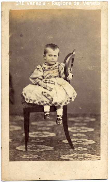 Ritratto: in studio, figura intera, frontale - Bambina: seduta - Vestiario: abito chiaro, bordature scozzesi - Arredamento: sedia - Sfondo