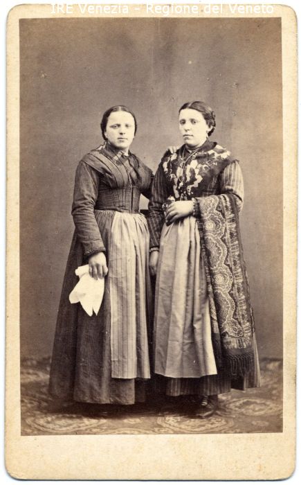 Ritratti: in studio, figure intere, frontali - Donne: due - Donna: a sinistra, in piedi, fazzoletto bianco in mano - Vestiario: abito scuro, grembiule chiaro a righe - Donna: a destra, in piedi, stola ripiegata sul braccio sinistro