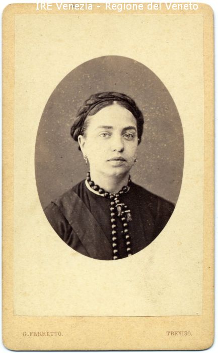 Ritratto di Maria Sandon - Ritratto: in studio, mezzo busto, frontale - Ragazza - Acconciatura: capelli raccolti, treccia - Vestiario: abito scuro - Gioielli: orecchini, collana con grosse perle scure - Sfondo