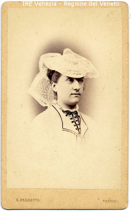 Ritratto: in studio, mezzo busto, in semi profilo - Donna - Vestiario: abito chiaro, bordi scuri, cappello con velo - Sfondo