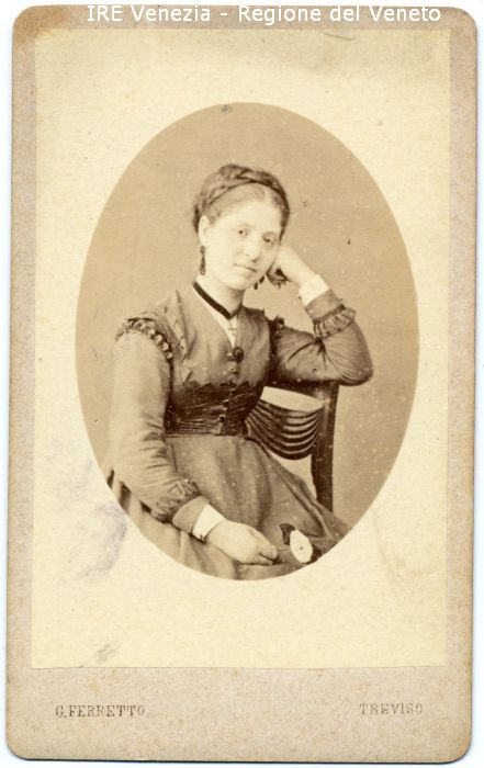 Ritratto: in studio, mezza figura, in semi profilo - Donna: seduta, con un fiore in mano, con il gomito destro appoggiato allo schienale di una sedia, mano che sorregge il capo - Acconciatura: capelli raccolti, treccia