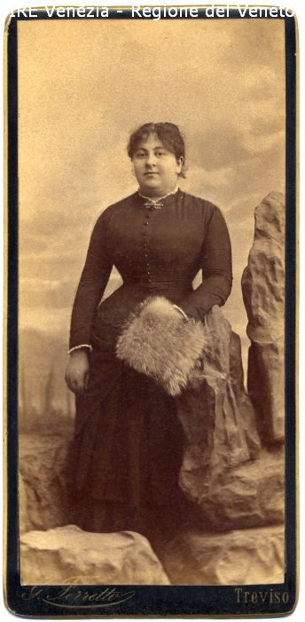Ritratto: in studio, figura intera, frontale - Donna: in piedi, appoggiata ad una roccia, con un manicotto scalda-mani in mano - Vestiario: abito scuro, bottoni, colletto e polsini bianchi - Accessori: manicotto scalda-mani in pelliccia