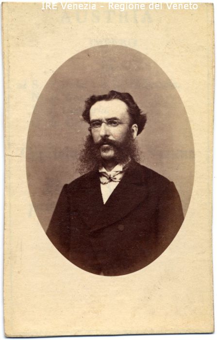 Ritratto: in studio, mezzo busto, frontale - Uomo: con occhiali, con baffi e barba - Vestiario: giacca scura doppiopetto, camicia bianca, cravattino - Sfondo
