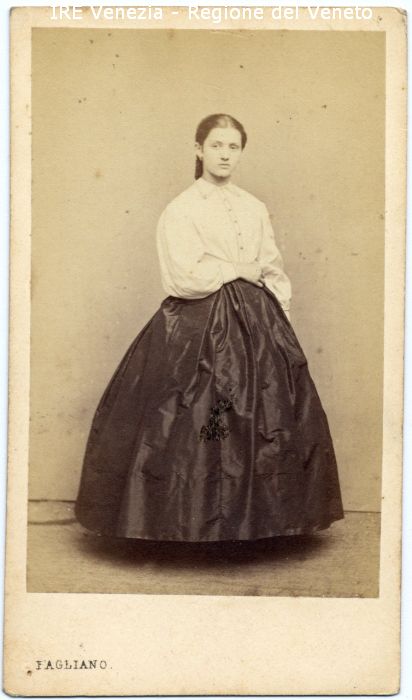 Ritratto: in studio, figura intera, frontale - Donna: in piedi - Vestiario: gonna ampia scura, camicia bianca - Gioielli: orecchini - Sfondo