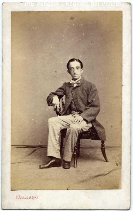 Ritratto: in studio, figura intera, frontale - Uomo: seduto, con il braccio destro appoggiato allo schienale della sedia - Vestiario: giacca lunga, pantaloni chiari a quadretti, farfallino - Arredamento: sedia in legno - Sfondo