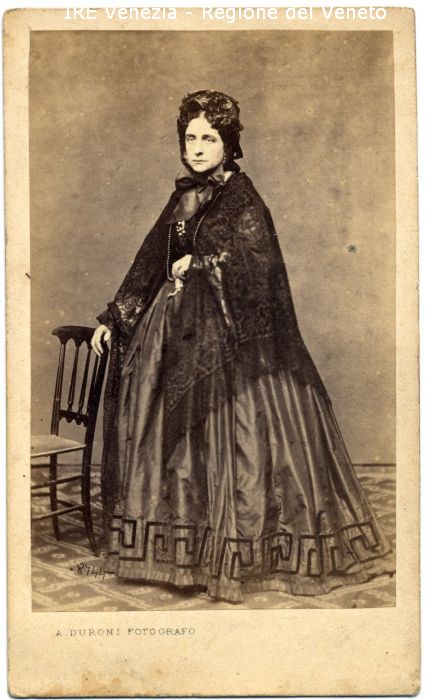 Ritratto: in studio, figura intera, in semi profilo - Donna: in piedi, con la mano appoggiata allo schienale di una sedia - Vestiario: abito scuro, bordatura inferiore della gonna con greca nera, scialle di pizzo nero, cappello legato sotto il mento