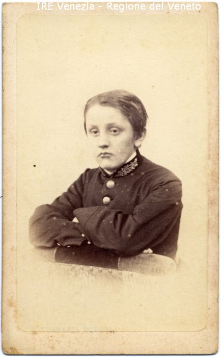 Ritratto: in studio, mezzo busto, in semi profilo - Ragazzo: con le braccia incrociate - Vestiario: uniforme militare, bottoni - Sfondo