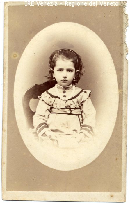 Ritratto: in studio, mezzo busto, frontale - Bambina: seduta, con in mano un foglio - Vestiario: abito chiaro con voulan - Gioielli: orecchini pendenti, collana con perle bianche - Arredamento: sedia - Sfondo