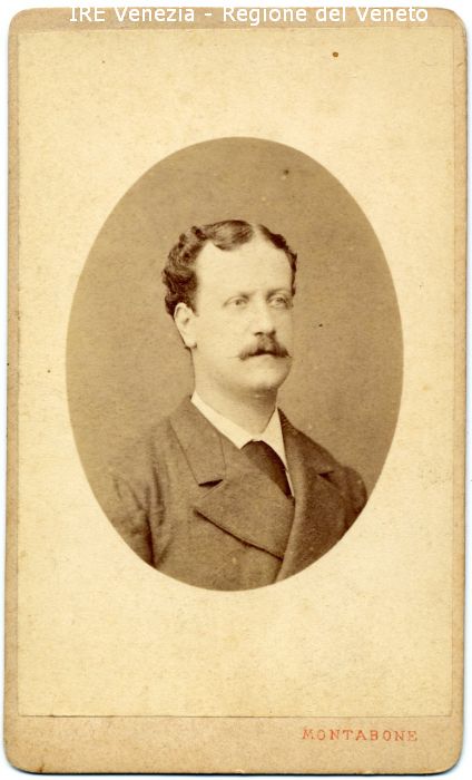 Ritratto di Ricardo Revedin di Treviso - Ritratto: in studio, mezzo busto, in semi profilo - Uomo: con baffi - Vestiario: giacca, camicia bianca, cravatta - Sfondo