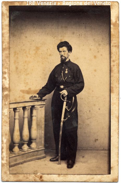 Ritratto: in studio, figura intera, in semi profilo - Uomo: con baffi e pizzetto, in piedi, con una mano appoggiata su una balaustra, con una sciabola - Vestiario: uniforme militare, cintura con fibbia, medaglia, cappello sulla balaustra, sciabola