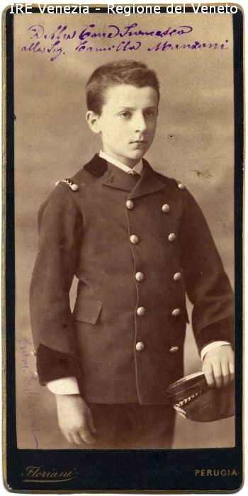 Ritratto di Francesco Della Torre - Ritratto: in studio, mezza figura, in semi profilo - Bambino: in piedi, berretto in mano - Vestiario: divisa, bottoni, camicia bianca - Sfondo