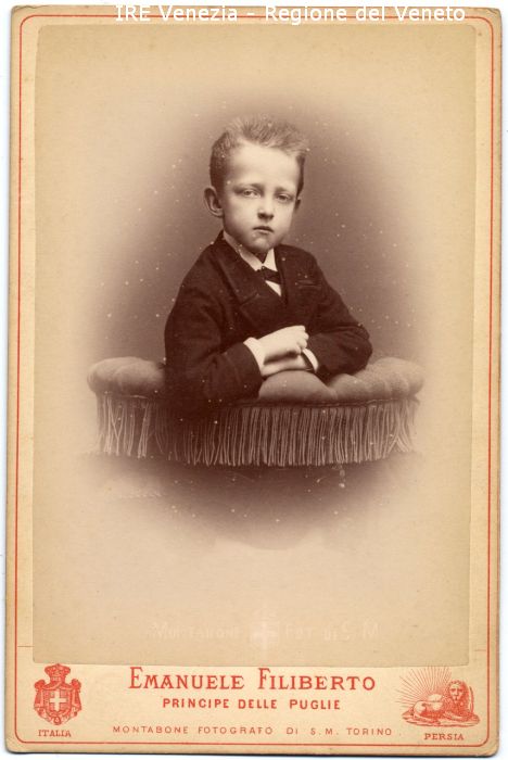 Ritratto di Emanuele Filiberto di Savoia Principe delle Puglie - Ritratto: in studio, mezzo busto, frontale - Bambino: seduto, appoggiato allo schienale di una poltroncina - Vestiario: giacca scura, camicia bianca, cravattino