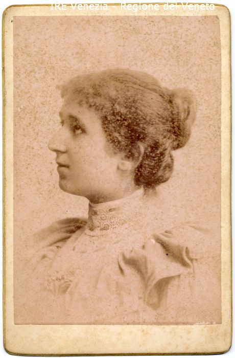 Ritratto: in studio, mezzo busto, in profilo - Donna - Acconciatura: chignon - Vestiario: abito chiaro, colletto alto ricamato, voulan - Sfondo