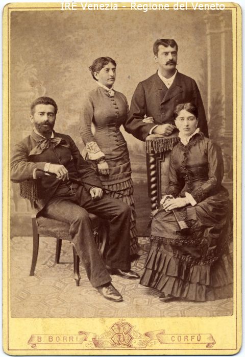 Ritratto di gruppo: fratelli Serin, in studio, figure intere - Persone: quattro, due uomini e due donne - Uomo: con baffi e barba, seduto, bastone in mano, fiocco - Donna: seduta, ventaglio - Vestiario: abito con voulan, ricami, perline