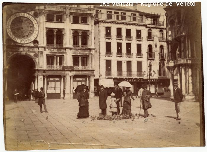 Fondale: Piazza S. Marco, Basilica di S. Marco, Torre dell'orologio, palazzi, negozi