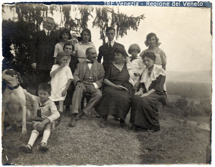 Prof. Molon - Ritratti: di gruppo, all'esterno, figure intere - Persone: dodici, tre uomini, cinque donne, quattro bambini, un cane - Fondale: paesaggio, giardino, collina, alberi, pino