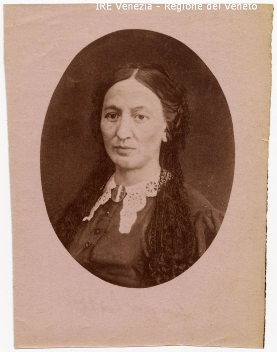 Luigia Bossi - Ritratto: in studio, mezzo busto, frontale - Donna - Vestiario: abito con colletto in pizzo bianco - Gioielli: spilla - Sfondo