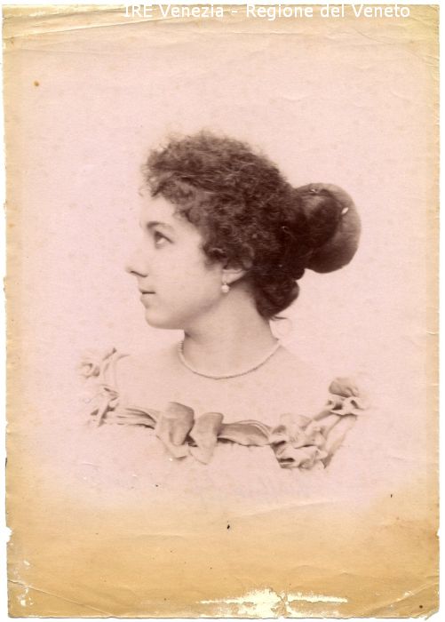 Buffoni figlia del questore - Ritratto: in studio, mezzo busto, in profilo - Donna: giovane - Acconciatura: capelli raccolti, chignon - Vestiario: abito con scollo quadrato, nastri, fiocchi - Gioielli: orecchini di perle, collana di perle - Sfondo