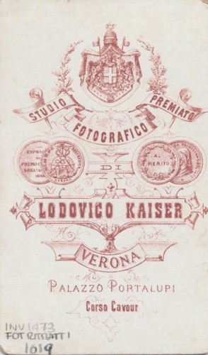 • STEMMI sul supporto secondario: verso - dell'autore - Marchio - Marchio tipografico dell'autore che riporta la scritta: "Studio fotografico/ premiato/ Lodovico Kaiser/ Verona/ Palazzo Portalupi/ Corso Cavour" e la riproduzione di due medaglie, di cui una per la partecipazione all'esposizione per il centenario dell'Accademia d'agricoltura, commercio ed arti di Verona (1868).