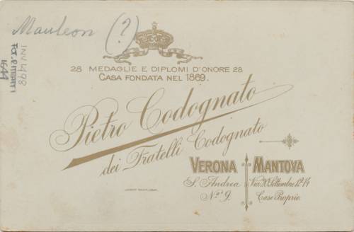 - STEMMI Sul supporto secondario: verso: al centro - dell'autore - Marchio - Marchio dell'autore che riporta la scritta "28 medaglie e diplomi d'onore 28/ Casa fondata nel 1869./ Pietro Codognato/ dei Fratelli Codognato" e gli indirizzi degli stabilimenti di Verona e Mantova.