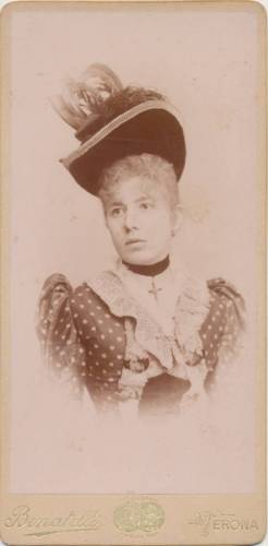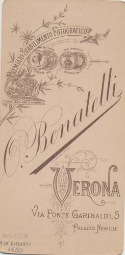 - STEMMI Sul supporto secondario: verso - dell'autore - Marchio - Marchio dell'autore con la scritta "Premiato stabilimento Fotografico/ O. Benatelli/ Verona/ Via Ponte Garibaldi, 5/ Palazzo Newille" e la riproduzione delle medaglie ottenute a Parigi, Firenze e Vicenza.