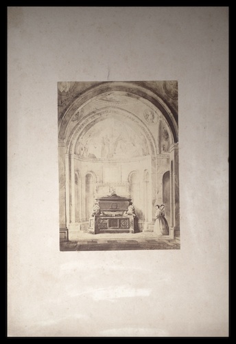 - NOTIZIE STORICO CRITICHE Dal confronto con l'album (vedi campo strutturato FNT) cui appartiene l'esemplare aggregato, la didascalia relativa all'immagine recita: «[c. 5r:] [titolazione:] Tavola X./ Tipo del sarcofago che era provvisoriamente stato costrutto in legno e collocato nellatrio della/ Basilica di San Marco. Un [sic] urna cineraria sostenuta da quattro leoni accosciati [sic] in atto di dolo=/ roso ruggito; sul coperchio il codice delle leggi inghirlandato di alloro.»