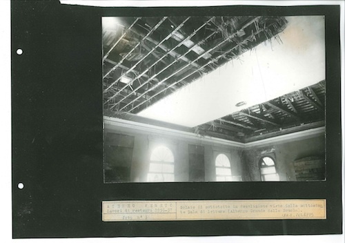 Ateneo Veneto Lavori di restauro 1956-57: foto n° 3: Solaio di sottotetto in demolizione visto dalla sottostante Sala di lettura (Albergo Grande della Scuola).