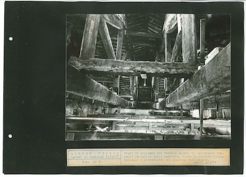 Ateneo Veneto Lavori di restauro 1956-57: foto n° 5: Travi di sostegno del vecchio solaio di sottotetto fungenti da catene dele capriate, viste di scorcio longitudinale e presentanti una paurosa inflessione.