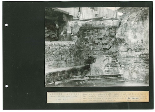 Ateneo Veneto Lavori di restauro 1956-57: foto n° 7: Muratura di perimetro allo spigolo est-sud (verso Campo San Fantin): Osservare le slegature e le breccie in passato non colmate e la trave a doppio T da tempo applicata con funzione di tirante.