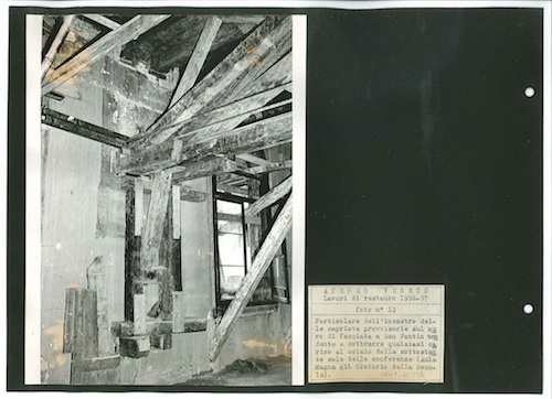 Ateneo Veneto Lavori di restauro 1956-57: foto n° 12: Particolare dell'incastro delle capriate provvisorie sul muro di facciata a San Fantin tendente a sottrarre qualsiasi carico al solaio della sottostante sala delle conferenze (Aula Magna già Oratorio della Scuola).