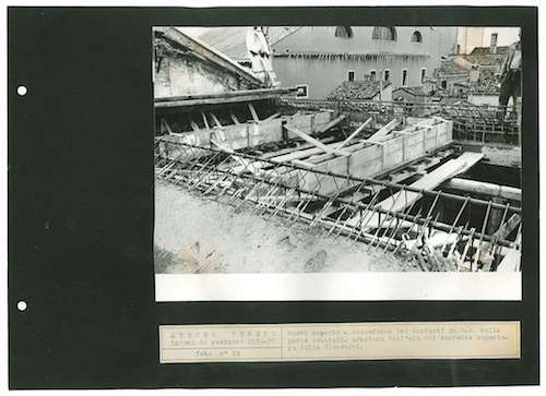 Ateneo Veneto Lavori di restauro 1956-57: foto n° 23: Nuovo coperto - casseiforme dei montanti in c.a. nella parte centrale. Armatura dell'ala del corrente superiore della Vierendel.