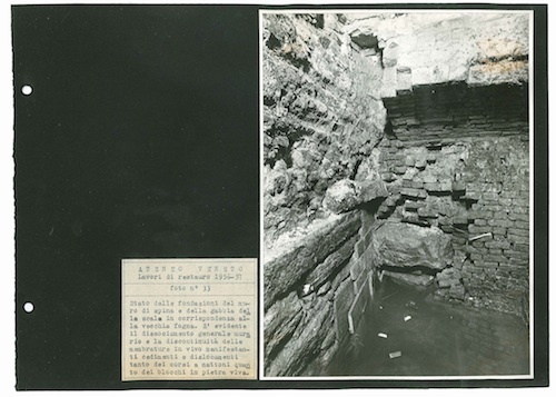 Ateneo Veneto Lavori di restauro 1956-57: foto n° 33: Stato delle fondazioni del muro di spina e della gabbia della scala in corrispondenza alla vecchia fogna. E evidente il dissociamento generale murario e la discontinuità delle membrature in vivo manifestanti cedimenti e dislocamenti tanto dei corsi a mattoni quanto dei blocchi in pietra viva.