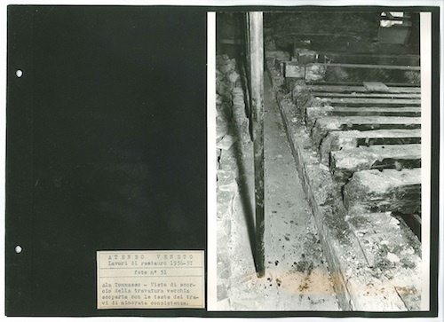 Ateneo Veneto Lavori di restauro 1956-57: foto n° 51: Ala Tommaseo - Vista di scorcio della travatura vecchia scoperta con le teste dei travi di minorata consistenza.