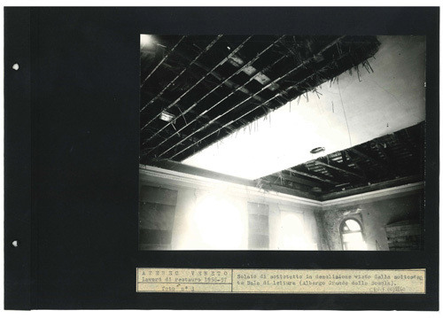Ateneo Veneto Lavori di restauro 1956-57: foto n° 3: Solaio di sottotetto in demolizione visto dalla sottostante Sala di lettura (Albergo Grande della Scuola).