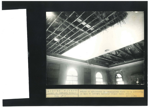 Ateneo Veneto Lavori di restauro 1956-57: foto n° 3: Solaio di sottotetto in demolizione visto dalla sottostante Sala di lettura (Albergo Grande della Scuola).