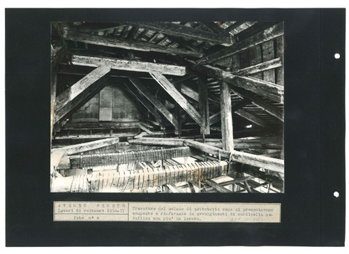 Ateneo Veneto Lavori di restauro 1956-57: foto n° 4: Travature del solaio di sottotetto come si presentavano composte e rinforzate da avvolgimenti di cordicella metallica non più in lavoro.