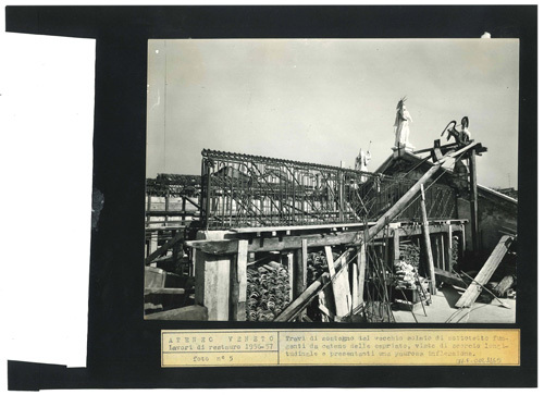 Ateneo Veneto Lavori di restauro 1956-57: foto n° 5: Travi di sostegno del vecchio solaio di sottotetto fungenti da catene dele capriate, viste di scorcio longitudinale e presentanti una paurosa inflessione.