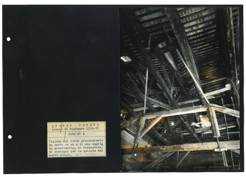 Ateneo Veneto Lavori di restauro 1956-57: foto n° 9: Visione del tetto preesistente da sotto in su e di una capriata provvisoria, in formazione, di sostegno per la gettata del nuovo solaio.