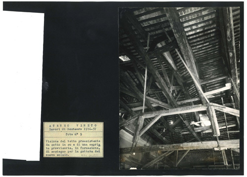 Ateneo Veneto Lavori di restauro 1956-57: foto n° 9: Visione del tetto preesistente da sotto in su e di una capriata provvisoria, in formazione, di sostegno per la gettata del nuovo solaio.