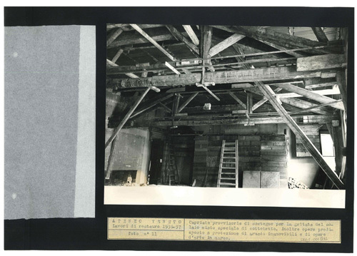 Ateneo Veneto Lavori di restauro 1956-57: foto n° 11: Capriate provvisorie di sostegno per la gettata del solaio misto speciale di sottotetto. Inoltre opere predisposte a protezione di armadi inamovibili e di opere d'arte in marmo.
