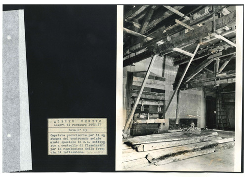 Ateneo Veneto Lavori di restauro 1956-57: foto n° 13: Capriate provvisiorie per il sostegno del costruendo solaio misto speciale in c.a. sottoposte a controllo di flessimetri per la regolazione della freccia di inflessione.