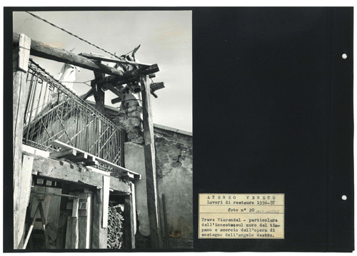 Ateneo Veneto Lavori di restauro 1956-57: foto n° 20: Trave Vierendel - particolare dell'innesto sul muro del timpano e scorcio dell'opera di sostegno dell'angelo destro.