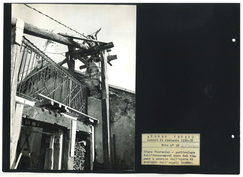 Ateneo Veneto Lavori di restauro 1956-57: foto n° 20: Trave Vierendel - particolare dell'innesto sul muro del timpano e scorcio dell'opera di sostegno dell'angelo destro.