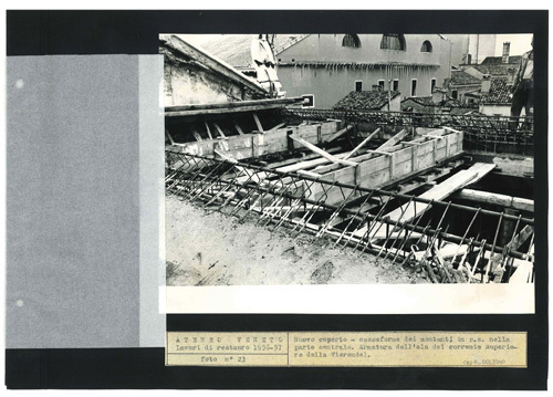 Ateneo Veneto Lavori di restauro 1956-57: foto n° 23: Nuovo coperto - casseiforme dei montanti in c.a. nella parte centrale. Armatura dell'ala del corrente superiore della Vierendel.