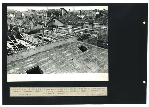 Ateneo Veneto Lavori di restauro 1956-57: foto n° 24: Nuovo coperto con fori per i lucernai nelle falde laterali e nuova costruzione terminale sopra il corridoio di accesso al sottotetto.