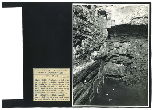 Ateneo Veneto Lavori di restauro 1956-57: foto n° 33: Stato delle fondazioni del muro di spina e della gabbia della scala in corrispondenza alla vecchia fogna. E evidente il dissociamento generale murario e la discontinuità delle membrature in vivo manifestanti cedimenti e dislocamenti tanto dei corsi a mattoni quanto dei blocchi in pietra viva.
