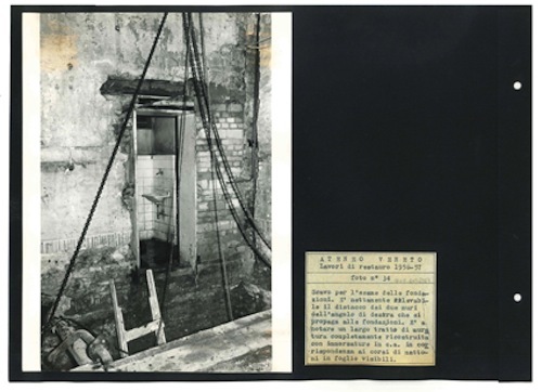 Ateneo Veneto Lavori di restauro 1956-57: foto n° 34: Scavo per lesame delle fondazioni. E nettamente rilevabile il distacco dei due muri dellangolo di destra che si propaga alle fondazioni. E a notare un largo tratto di muratura completamente ricostruita con immorsature in c.a. in corrispondenza ai corsi di mattoni in foglio visibili.