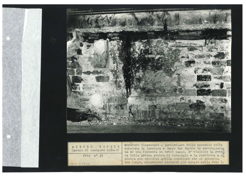Ateneo Veneto Lavori di restauro 1956-57: foto n° 39: Murature dissociate - particolare dello specchio della muratura in facciata a Campo San Fantin in corrispondenza ad una finestra su detto campo. E visibile la rottura della grossa pietra di davanzale e la fenditura sinistra che continua quella superiore che si presenta con largo, minaccioso distacco già notato nella foto 7.