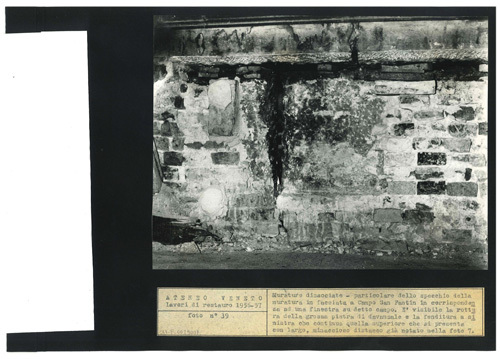 Ateneo Veneto Lavori di restauro 1956-57: foto n° 39: Murature dissociate - particolare dello specchio della muratura in facciata a Campo San Fantin in corrispondenza ad una finestra su detto campo. E visibile la rottura della grossa pietra di davanzale e la fenditura sinistra che continua quella superiore che si presenta con largo, minaccioso distacco già notato nella foto 7.